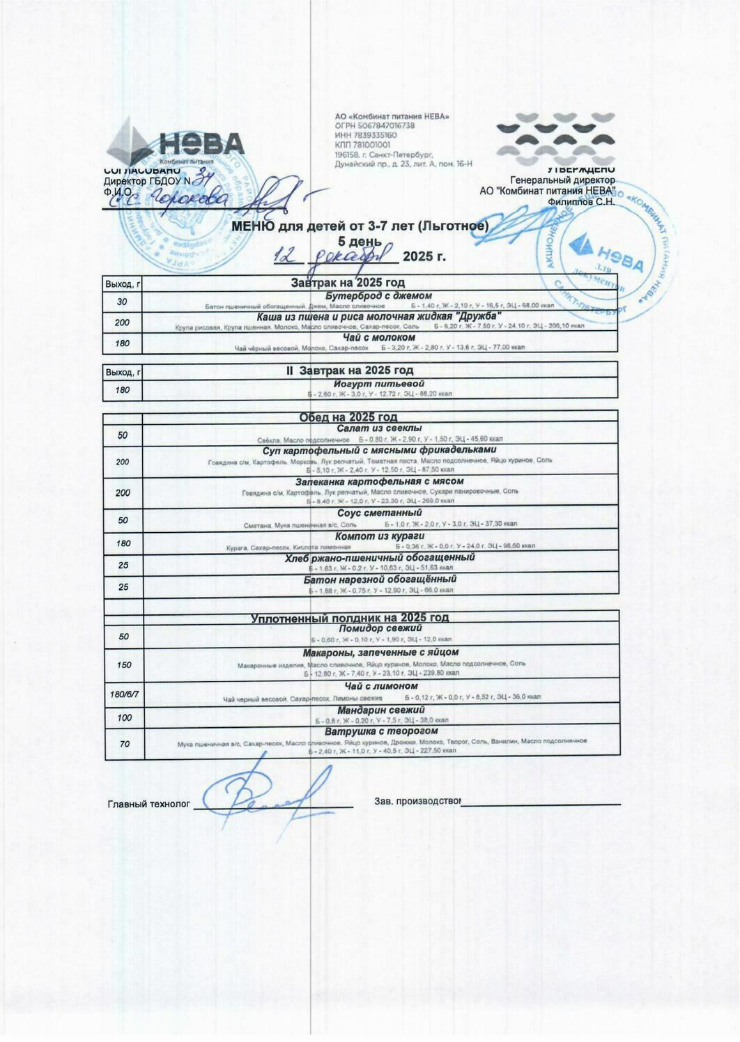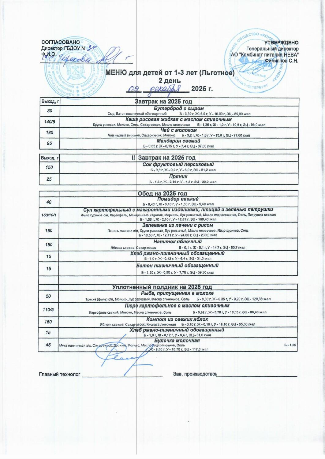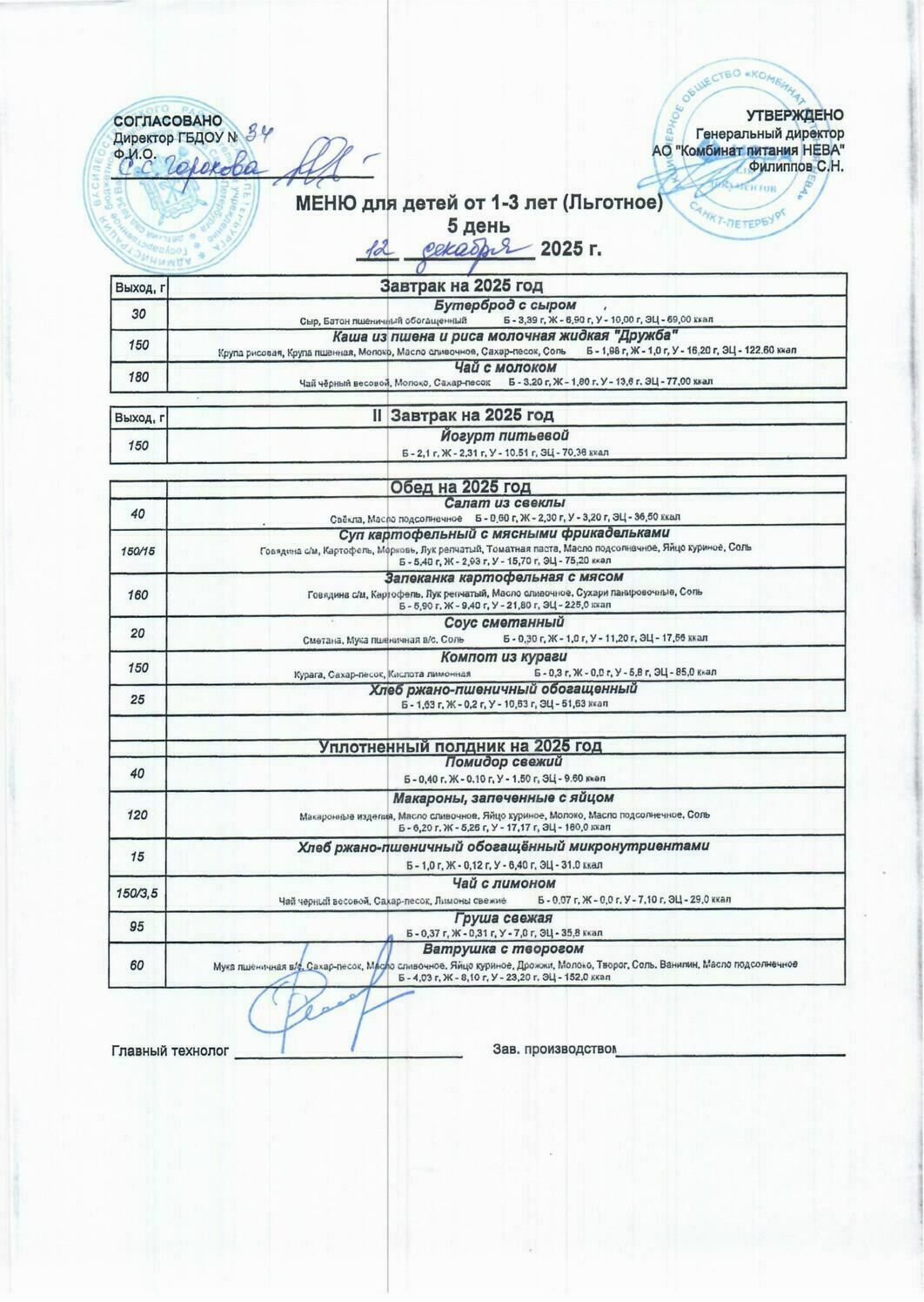 В каждой группе вывешивается меню на каждый день, подписанное заведующим детским садом. Меню сбалансировано по белкам, жирам, углеводам, выведены калории.