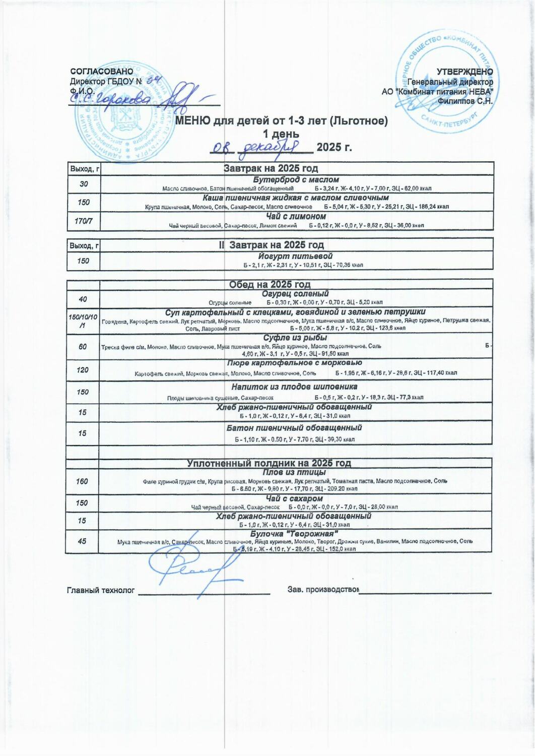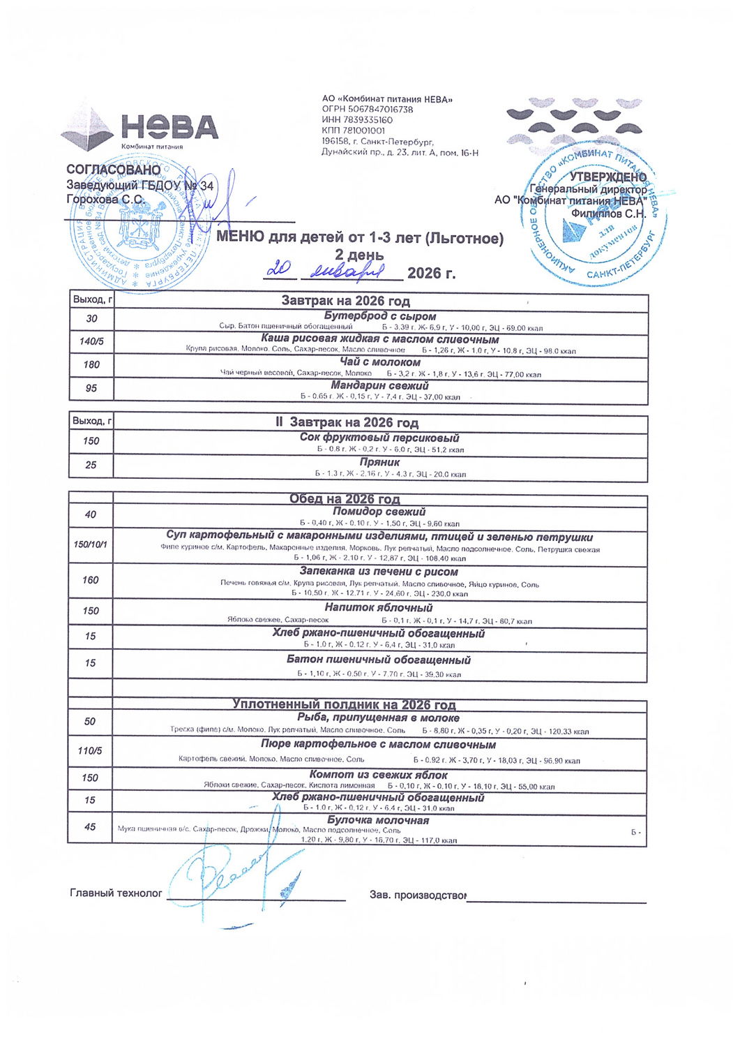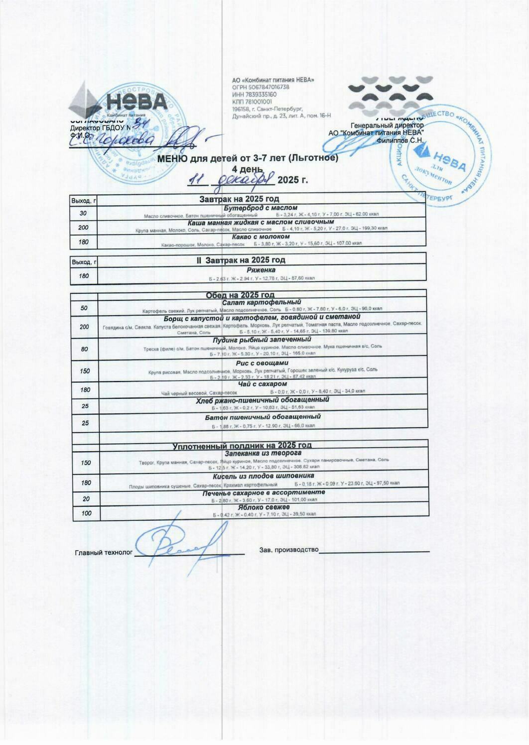 В каждой группе вывешивается меню на каждый день, подписанное заведующим детским садом. Меню сбалансировано по белкам, жирам, углеводам, выведены калории.