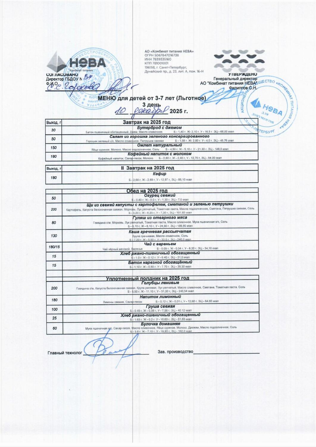Образовательное учреждение работает по цикличному десятидневному меню для организации питания детей, разработанному Управлением социального питания Санкт- Петербурга для государственных дошкольных образовательных учреждений города и утвержденному заместителем руководителя Управления Федеральной службы по надзору в сфере защиты прав потребителей и благополучия человека по городу Санкт-Петербургу.